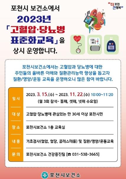 [한국뉴스타임=편집국] 포천시보건소는 심뇌혈관질환 예방관리사업과 관련해 고혈압, 당뇨병 질환 및 영양, 운동에 대한 표준화교육을 실시한다.