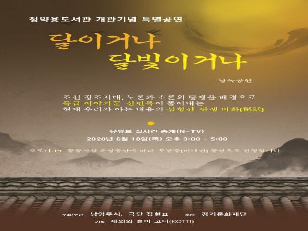 [KNT한국뉴스타임=남양주] 남양주시(시장 조광한)와 극단 집현Ⅱ(대표 최경희)가 오는 6월 18일(목) 오후 3시 정약용도서관 공연장에서 특별공연‘달이거나 달빛이거나’를 무관중 비대면 방식의 온라인 생중계 (남양주시 공식 유튜브 채널 MY N-TV)로 실시한다고 밝혔다.