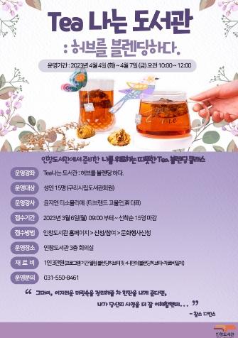 [한국뉴스타임=편집국] 구리시 인창도서관은 오는 6일부터 상반기 시민교양강좌 『Tea나는 도서관 : 허브를 블렌딩하다』 수강생(15명)을 선착순으로 모집한다.