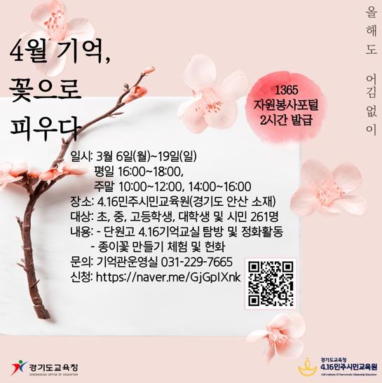 [한국뉴스타임=편집국] 4.16민주시민교육원이 세월호 참사 9주기를 맞아 단원고 4.16기억교실의 의미를 되새기기 위해 ‘4월 기억, 꽃으로 피우다’프로그램 참가자를 모집한다.