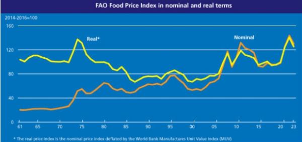 [한국뉴스타임=편집국] 유엔 식량농업기구(FAO)에 따르면, 2023년 2월 세계식량가격지수는 전월(130.6포인트) 대비 0.6% 하락한 129.8포인트를 기록했다. 곡물을 비롯한 대부분 품목군의 가격이 하락했으나 설탕 가격은 상승했다.