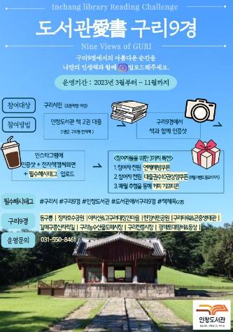 이번 프로그램은 구리시민이라면 누구나 자유롭게 참여 가능하며, 구리시 공식 채널을 기반으로 구리시 대표 관광자원인 《구리9경》을 홍보하는 동시에 독서 동기부여를 통한 도서관 이용률 증대 및 ‘책 읽는 구리시’ 구현을 목표로 하고 있다.