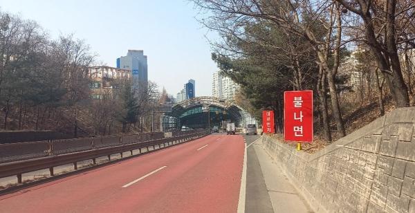 경기도 소방재난본부는 지난 3일 용인시 수지구 포은대로에 있는 방음터널 입구에 눈에 확 띄는 빨간색 바탕에 흰색 글씨로 ‘불나면 대피 먼저’가 적힌 화재 대피 안내표지판을 시범 설치했다.