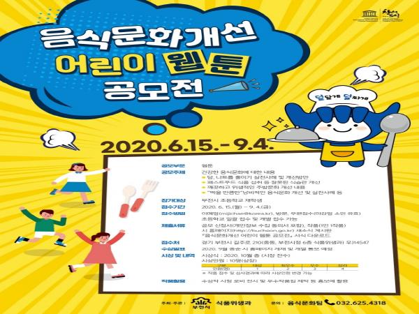 [KNT한국뉴스타임] 부천시가 어린이의 올바른 식습관 형성과 건강한 음식 문화 실천을 위해 ‘음식문화개선 어린이 웹툰 공모전’을 개최한다.