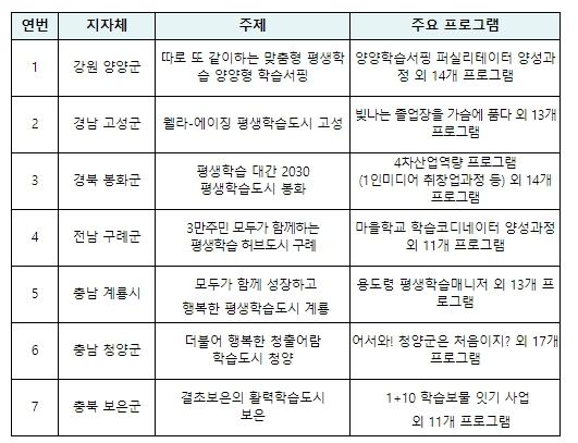 올해는 7개 기초지자체를 평생학습도시로 신규 선정하여 각 90백만 원 내외의 평생교육사업 운영비를 지원한다.