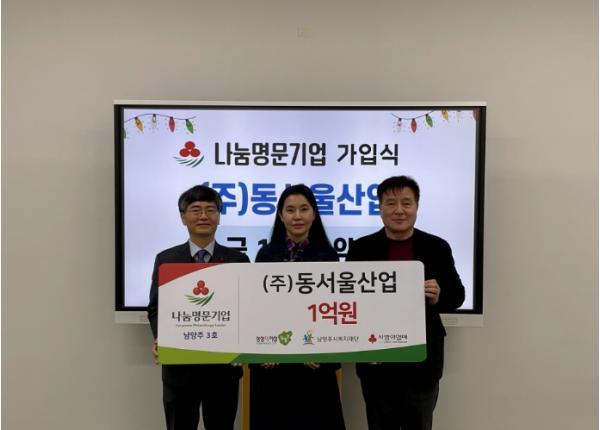 [한국뉴스타임=편집국] ㈜동서울산업은 지난 3일 남양주시 취약계층을 지원하기 위해 1억 원 기부를 약정하며 남양주시의 세 번째 나눔 명문기업이 됐다.