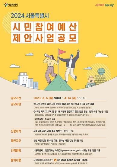 [한국뉴스타임=편집국] 서울시는 2024년도 시민참여예산 편성을 위한 시민 제안사업 접수를 3월 6일부터 4월 14일까지 진행한다고 밝혔다.