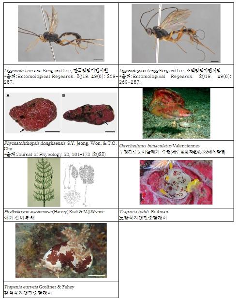 특히, 독도 동도에서 발견된 원핵생물 신종 ‘슈와넬라 독도넨시스(Shewanella dokdonensis)’와 동해 연안에서 발굴된 홍조류 신종 ‘필마토리톱시스 동해엔시스(Phymatolithopsis donghaensis)’도 독도와 동해 지명이 학명으로 쓰였다.
