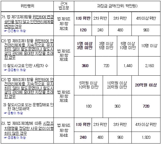 철도안전법은 인적 또는 물적 피해 규모에 따라 아래와 같이 과징금 부과 기준을 정하고 있다.