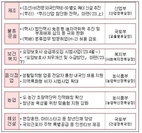 당장 현장인력이 필요하나 국내 인력유입이 어려운 업종의 상황을 고려하여 ’23년 단순외국인력(E-9) 쿼터를 11만명으로 확대하고, 월 평균 1만명 신속 입국을 추진하는 한편, 분기별 쿼터 배정을 상반기에 집중한다.