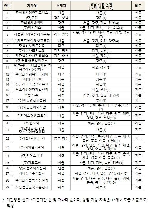 [한국뉴스타임=편집국] 고용노동부와 직업능력심사평가원(원장 최영섭)은 ?중장년 새출발 카운슬링?을 실시할 수 있는 운영기관을 추가로 선정하고 그 결과를 발표했다.
