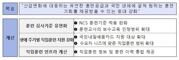 이에 따르면, 산업변화를 적시에 반영한 훈련공급을 확대할 수 있도록 NCS 훈련기준 적용을 완화하는 한편, 국민내일배움카드 지원 대상 요건을 완화하여 국민의 생애단계별 직업능력개발을 지원하고 고용가능성을 제고토록 했다.
