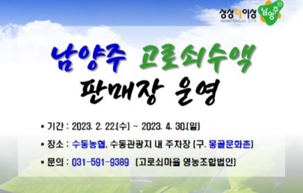 남양주 고로쇠 수액은 2월 22일부터 4월 30일까지 수동관광지 내 주차장(구. 몽골문화촌)에서 고로쇠마을 영농조합법인 직판장을 통해 구매 가능하며, 고로쇠 수액을 직접 채취하는 수동 작목반과 위탁 판매하고 있는 수동농협을 통해 전국 택배 주문도 가능하다.