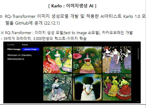 인사말씀에 이어, 이번 행사에서 카카오브레인의 초거대 AI 서비스인 Karlo(이미지 생성 AI), KoGPT(언어모델 AI)를 처음으로 공식 시연했으며, 카카오 엔터프라이즈 백상엽 대표가‘초거대 AI 동향 및 국내 경쟁력 강화방안 제언’에 대하여 발표했다.