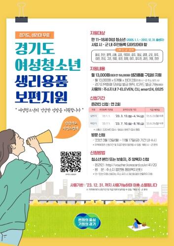 [한국뉴스타임=편집국] 경기도가 여성청소년에게 1인당 월 1만 3천 원의 생리용품 구입비를 지원하는 ‘2023년 여성청소년 생리용품 보편 지원사업’ 신청접수를 13일부터 시작한다.