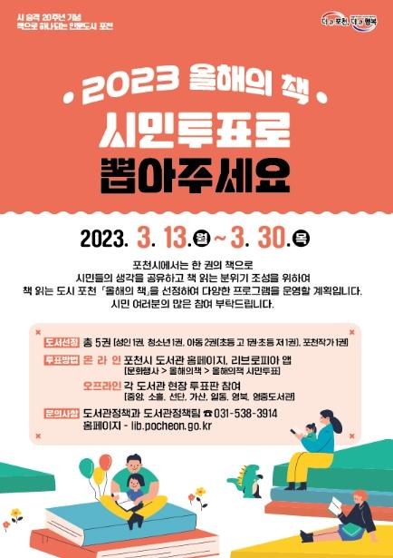 [한국뉴스타임=편집국] 포천시도서관에서는 3월 13일(월)부터 30일(목)까지 시 승격 20주년을 기념해 1년동안 시민이 함께 읽을 ‘2023년 포천시 올해의 책’ 후보 도서에 대한 시민투표를 진행한다고 밝혔다.