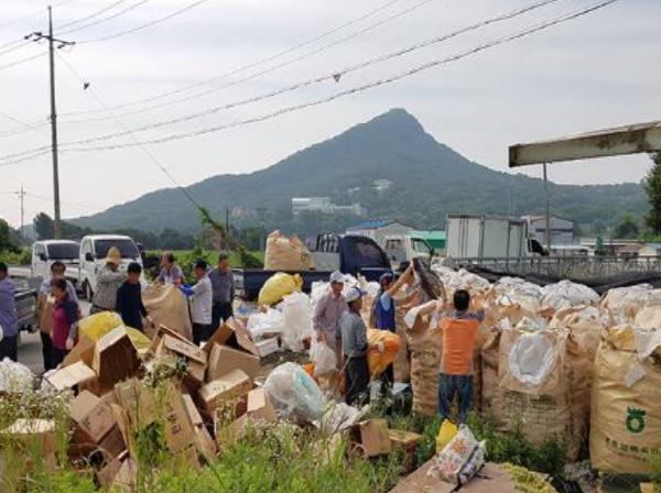 이날 59개 마을 이장들은 트럭을 이용해 각 마을에서 수거한 폐농약병을 백암면 용천리 공터로 날랐다. 이렇게 모은 폐농약병은 30여톤에 달했다.