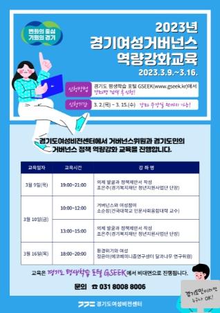 [한국뉴스타임=편집국] 경기도여성비전센터가 9일과 10일, 16일 3일간 경기도평생학습포털 지식(GSEEK)에서 ‘경기여성거버넌스 역량강화교육’를 연다.