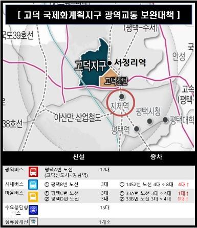 구체적으로 고덕국제화계획지구에는 시내버스 1개 노선(3대 운행 예정)과 마을버스 2개 노선(각 3대 운행 예정)을 신설해 교통 거점인 서정리역(1호선), 평택 지제역(1호선, SRT), 광역버스 주요 정류장까지 접근성을 개선할 계획이다. 기존 노선 중 시내버스(1452번)는 4대 증차, 마을버스(33A번, 33B번)는 각 1대씩 증차한다.