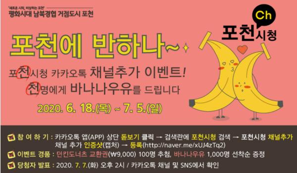 또한, 시는 카카오톡 채널 추가 이벤트를 진행한다. 6월 18일부터 7월 5일까지 포천시청 ‘카카오톡 채널’을 추가한 인증샷(캡처본)을 네이버폼(http://naver.me/xUJ4zTq2)을 통해 첨부 작성하면, 선착순 1,000명에게 바나나 우유를, 추첨으로 100명에게 던킨 도너츠 9천원권을 지급한다.