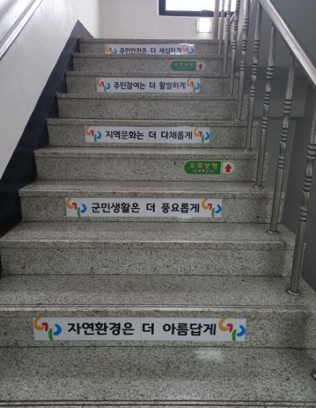 지역주민이 군정을 이해하고 함께 하는 더 활발한 주민참여 행정을 추진하고자 군정비전과 슬로건, 군정방침스티커를 비예산으로 제작하여 주민이 자주 찾는 행정복지센터 내 계단에 부착하여, 지역주민이 자연스럽게 군정비전을 공유하는 공감행정을 펼치고 있다.
