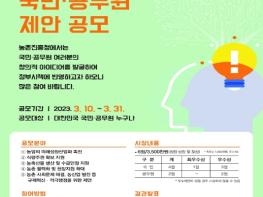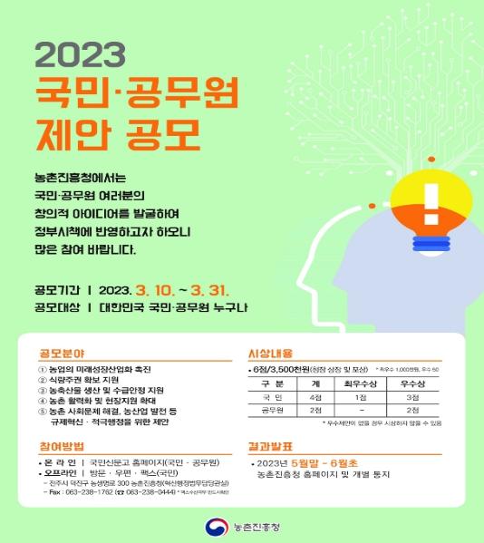 [한국뉴스타임=편집국] 농촌진흥청은 3월 10일부터 3월 31일까지 학생, 시민, 공무원 등 전 국민을 대상으로 ‘2023년 국민?공무원 제안 공모전’을 실시한다고 밝혔다.