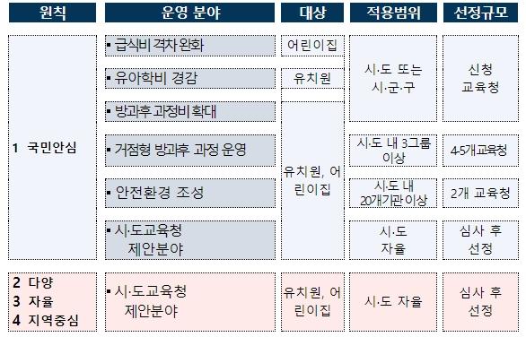 선도교육청은 국민안심, 다양, 자율, 지역 중심의 유보통합 원칙으로, 학부모 부담경감, 돌봄 여건 개선, 안전한 교육?돌봄 환경 개선 등 격차 완화 과제와 지역 여건과 특수성을 고려한 시?도교육청 제안 과제를 운영한다.