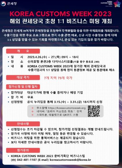 이진희 코리아 커스텀즈 위크 2023 준비기획단장은 “통상적으로 수출기업이 현지 관세당국을 접촉하거나 소통하는 것이 쉽지 않은 상황에서, 이번에 기획한 비즈니스 회의(미팅)는 수출기업과 수출상대국 관세당국간 협력과 소통의 장을 마련하여 우리 수출기업들을 직·간접적으로 지원하기 위한 것”이라고 하면서 “원산지·품목분류 분쟁, 통관지연 등 수출 시 통관단계에서 어려움을 겪고 있거나 해외시장에 진출할 계획을 갖고 있는 기업들은 이번 기회를 적극 활용하길 바란다.”고 당부했다.