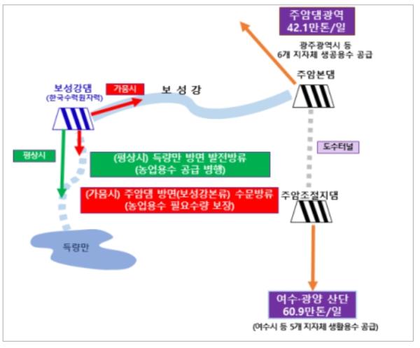 수력발전댐(한국수력원자력㈜ 운영)인 보성강댐은 득량만(전남 고흥) 방면으로 농업용수를 방류하여 전력을 생산하던 기존의 운영방식을 지난해 7월부터 이루어진 보성강댐-주암댐 연계 운영에 따라 다음과 같이 변경한 바 있다.