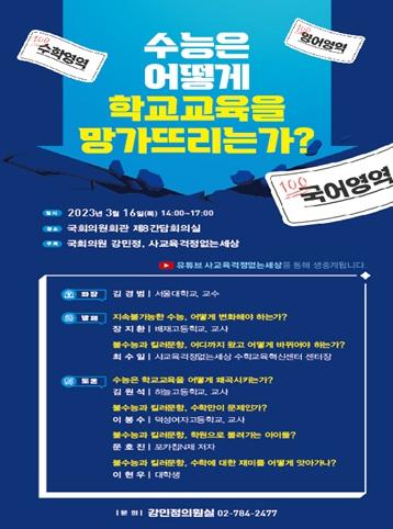 2023년 3월 16일 14시부터 국회의원회관 제8간담회의실에서 진행될 ‘수능은 어떻게 학교교육을 망가뜨리는가?’ 토론회에서는 지금의 수능이 학생들을 등급화하여 선별하기 위한 목적으로만 활용되고 있는 현실과 부정적 효과들을 지적하고 그에 대한 개선방안을 모색할 계획이다.