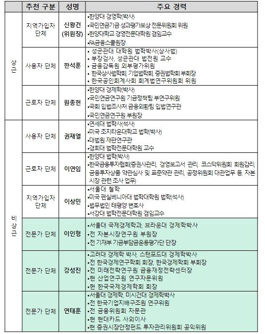 연태훈 위원(한국금융연구원 선임연구위원)은 국민연금기금 투자정책전문위원으로 활동한 경력이 있고, 현재는 사학연금 리스크관리위원 및 연기금투자풀 운영위원으로 기금운용에 대한 경험과 지식이 있는 금융경제전문가다.