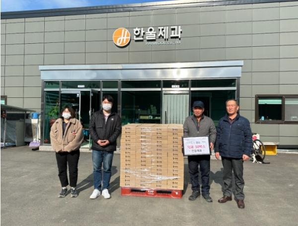 [한국뉴스타임=편집국] 포천시 가산면에 소재한 한울제과는 지난 3월 14일 관내 사회복지시설에 약과 50박스(250만 원 상당)를 기탁해 이웃사랑을 전했다.