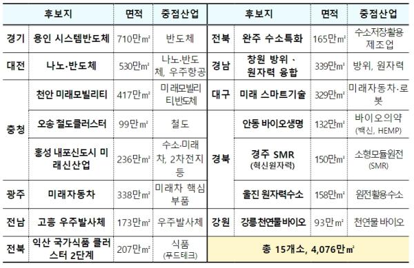 반도체·미래차·우주·원전 등 미래 첨단산업 육성을 위해 총 4,076만㎡(약 1,200만평) 규모의 15개 국가산업단지를 조성하여 기업 투자를 전폭적으로 지원할 예정이다.