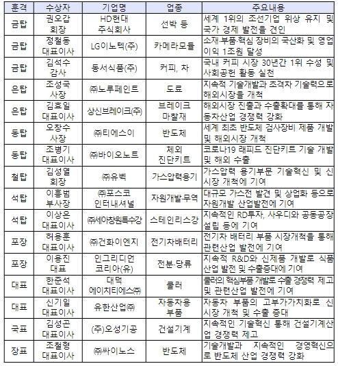 최고 영예인 금탑산업훈장은 지속적인 혁신과 도전으로 국?내외 시장 업계 1위의 위상을 일궈 국가산업발전에 기여하고, ESG경영을 통해 기업의 사회적 책임을 실천한 기업대표 3명에게 돌아갔다.