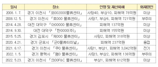 2021년 경기도 이천시의 한 물류센터에서 화재가 발생해 1명이 사망하고, 1명이 다쳤으며 3,042억원 재산피해가 발생했다. 2022년에는 경기도 평택시 소재 물류센터 화재로 3명이 사망하고, 2명이 부상을 입었으며, 136억원의 재산피해가 발생한 바 있다.