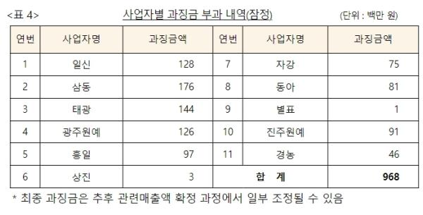 공정위는 이들 11개 비닐하우스 필름 제조사에게 시정명령(행위금지명령 및 교육 실시 명령)과 함께 과징금 총 9억 68백만원(잠정)을 부과하기로 결정했다.