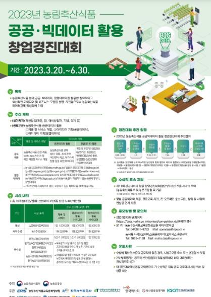 [한국뉴스타임=편집국] 농림축산식품부는 농촌진흥청 등 농림축산식품 관계기관과 함께 3월 20일부터 6월 30일까지‘2023년 농림축산식품 공공·빅데이터 활용 창업경진대회’를 개최한다.