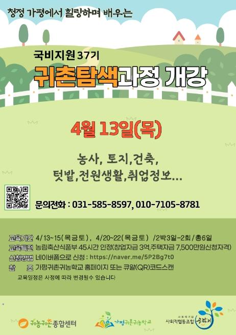 [한국뉴스타임=편집국] 가평귀촌귀농학교에서 ‘청정 가평에서 힐링하며 배우는 국비지원 37기 귀촌탐색과정’ 귀농귀촌 교육생을 모집한다.