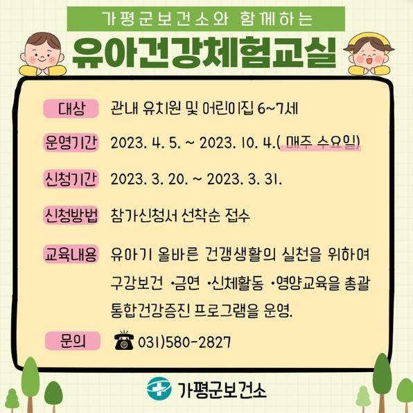 [한국뉴스타임=편집국] 가평군 보건소는 관내 아동을 대상으로 4월1일부터 10월4일까지 매주 수요일 가평군보건소 건강증진센터에서 '유아 건강 체험교실'을 운영한다.