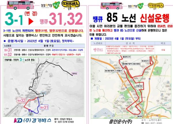 또한, 땡큐85번은 기존 양방향으로 운행되는 85A, 85B번(별내5단지~별내별가람역~별내역~평양골~별내5단지) 노선을 통합한 후 변경·증차해 별내동 및 별내면 지역 주민의 별내역과 별가람역 연계 편의성을 높이고, 별내파라곤스퀘어 지역 등 지식 산업 센터 밀집 지역의 교통 불편을 해소할 계획이다.