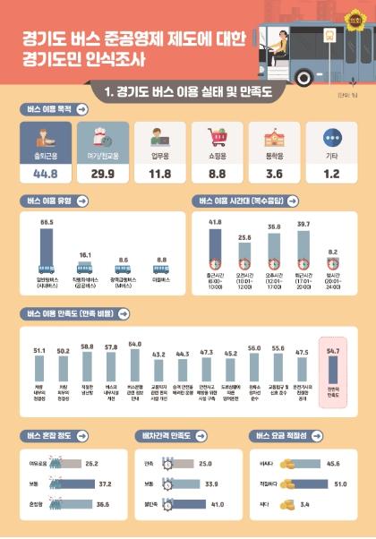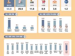 조사결과 버스 이용 목적으로 ‘출퇴근’을 위해 이용한다는 응답이 44.8%로 가장 많았으며, 이 응답자의 경우 버스 준공영제 확대에 대한 찬성의견이 84.9%로 높게 나타났다.