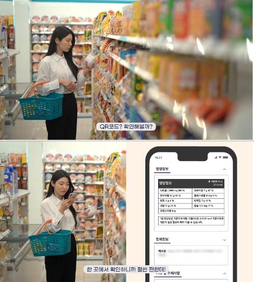 (소비자 관심정보) 소비자가 스마트폰 카메라로 제품에 표시된 QR을 확인하면 원재료, 영양성분 등 표시사항과 조리법 등 다양한 정보를 e-라벨로 확인할 수 있습니다.