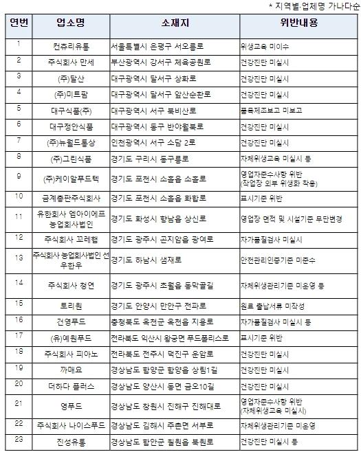 점검 결과 주요 위반내용은 ▲건강진단 미실시(9건) ▲영업자 준수사항 위반(2건) ▲자가품질검사 미실시(2건) ▲자체 위생관리기준 미운영(2건) ▲표시기준 위반(2건) 등이며 이번에 적발된 업체는 관할 지자체 행정처분 등의 조치 후 6개월 이내에 다시 점검해 개선 여부를 확인할 예정이다.