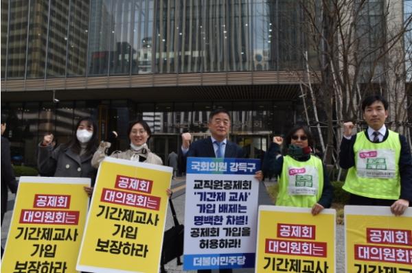 이어서, 강득구 의원은 금일 기자회견 후 오후 12시 30분, 한국교직원공제회관 앞에서 기간제 교사의 가입을 촉구하는 시위를 진행했다.