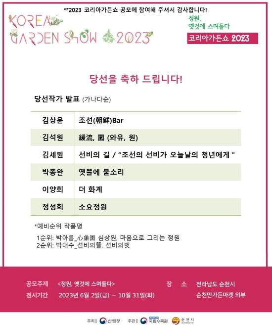 산림청이 주최하고 국립수목원과 순천시 공동 주관하여 올해로 8회째를 맞이하는 이번 '2023 코리아가든쇼' 공모전은 ‘정원, 옛것에 스며들다.’라는 주제로 지난 2월 1일부터 3월 9일까지 설계 공모를 받았다.
