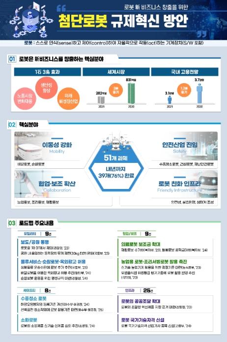 아울러, 수중청소로봇, 재난안전로봇 등 로봇의 안전서비스 시장 진입을 위한 기반을 마련하고, 의료?농업?음식점 등의 분야에서 협업?보조 로봇의 도입을 촉진하는 제도개선을 추진한다.