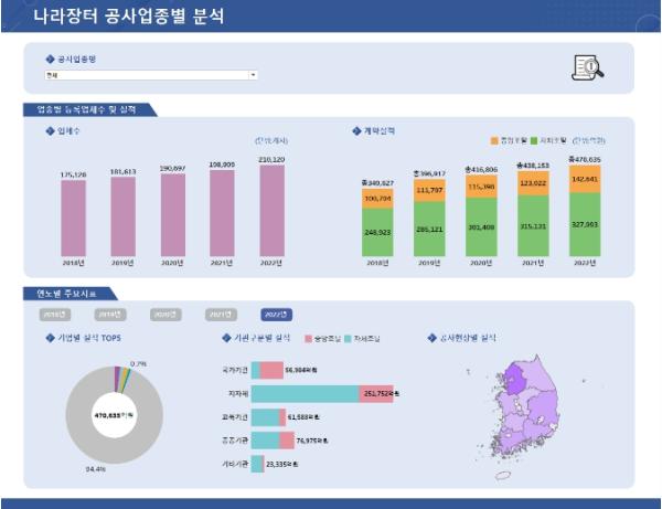 공사 분야 나라장터 등록업체 현황과 계약실적은 공사현장, 발주기관 유형별로 정밀 분석한 뒤 시각화해 공공공사의 변동추이를 쉽게 확인할 수 있다.