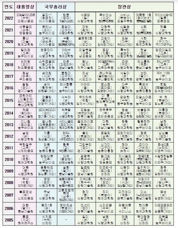 최종 선정된 8개 품종은 대통령상 1점, 국무총리상 2점(수출품종상 1점), 농림축산식품부장관상 5점(혁신상 1점)이며, 상장과 상금은 올 연말에 수여될 예정이다.
