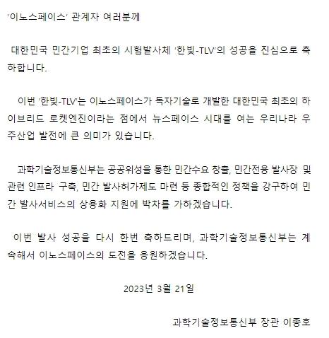 [한국뉴스타임=편집국] 과학기술정보통신부는 이종호 장관이 이노스페이스 김수종 대표에게 한빛-TLV 엔진 비행성능 검증 시험발사(3.19, 브라질) 성공에 대한 축하의 인사를 전했다고 밝혔다.