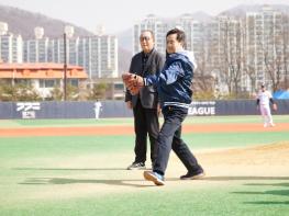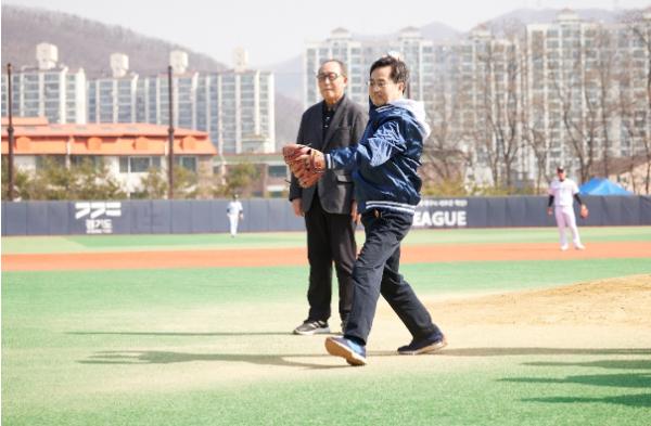 야구 유니폼을 입은 김 지사는 이영봉 경기도의회 문화체육관광위원회 위원장과 함께 마운드로 이동해 각각 시구와 시타를 한 뒤 야외관람석에서 개막전을 관람했다.